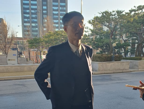 문형배 권한대행이 현대적인 건물 앞에서 미소를 짓고 있는 모습입니다. 그의 친근한 모습이 인상적입니다.