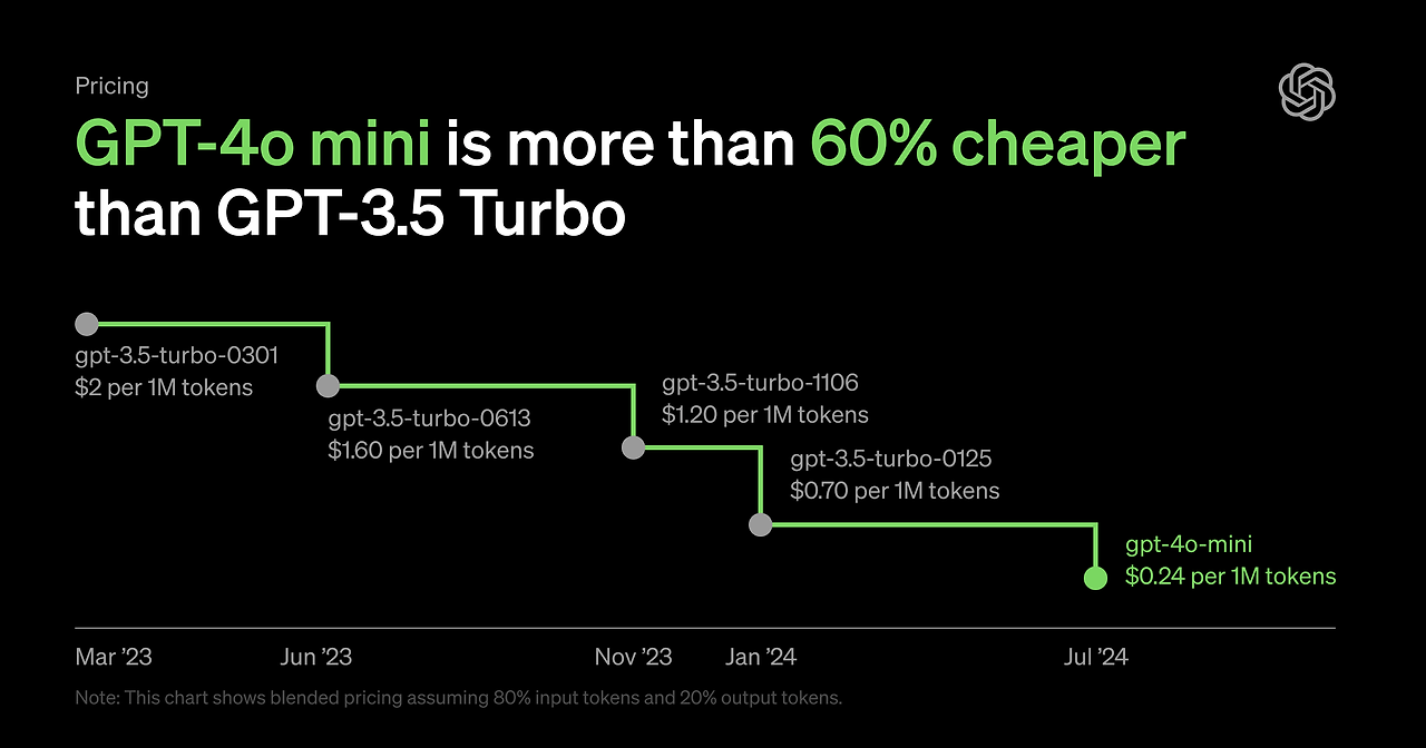 GPT-4o 미니는 GPT-3.5 Turbo보다 60% 이상 저렴한 가격으로 제공됩니다.