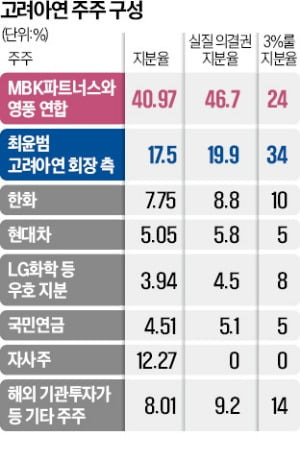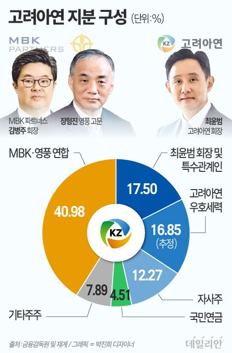 이 파이 차트는 각 주주의 소유 비율을 시각적으로 나타내고 있습니다. MBK Partners가 40.98%로 가장 큰 비율을 차지하고 있으며, 최윤범 회장 측이 17.50%로 뒤를 잇고 있습니다. 이러한 주주 구조는 경영권 분쟁에서 중요한 요소로 작용하고 있습니다.